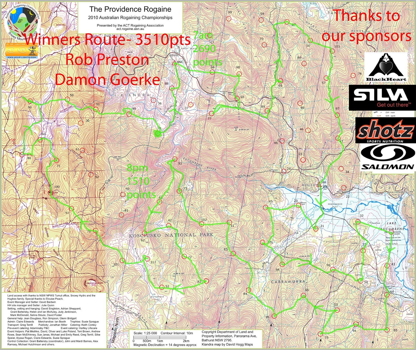 The course was set by experienced rogainers and ARers David Baldwin and Julie Quinn, who presented the competitors with a course full of choices and navigational challenges. The intricate contour detail made the control sites very challenging, especially at night. The terrain consisted of alpine ash forests, through snow gum woodlands and granite boulderfields, to open plains and ranged over an altitude of 1100 to nearly 1700m. The course covered by the team was about 90km, and collected 56 out of the possible 74 controls for a total score of 3510points. Western Australian team of Ben Corry and Paul Williams followed closely behind with 3460 points and Victorian Mixed team of Kevin Humphry and Kath Copeland were 3rd with 2890 points.